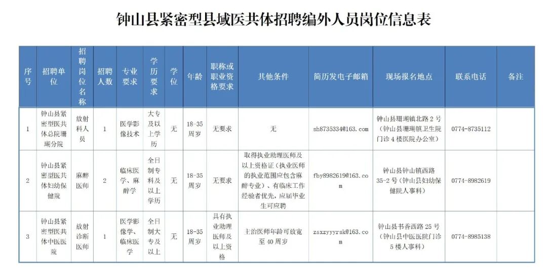 钟山县紧密型县域医疗卫生健康共同体公开招聘编外人员公告摘要