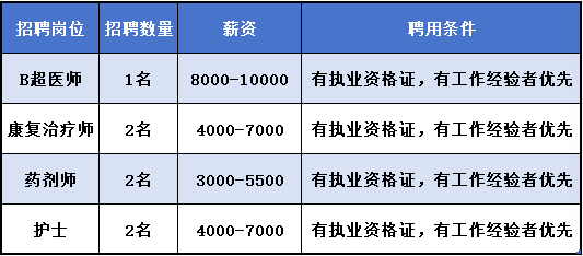 职位:B超医师|康复治疗师|药剂师|护士