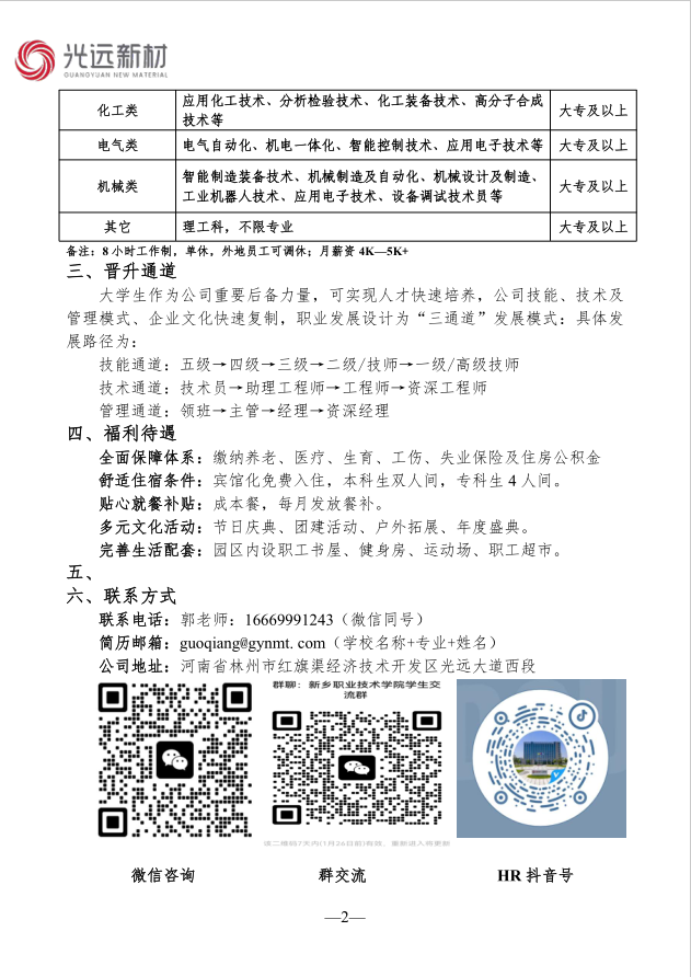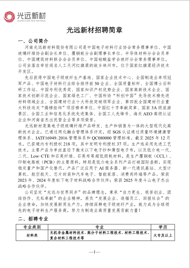 河南光远新材料股份有限公司招聘简章
