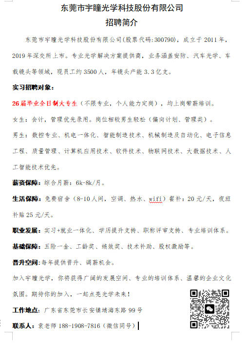 东莞市宇瞳光学科技股份有限公司招聘简介