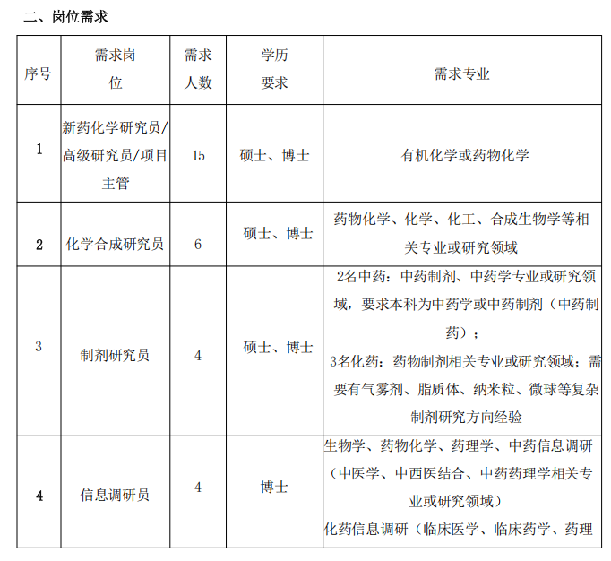 职位(2): 新药化学研究员