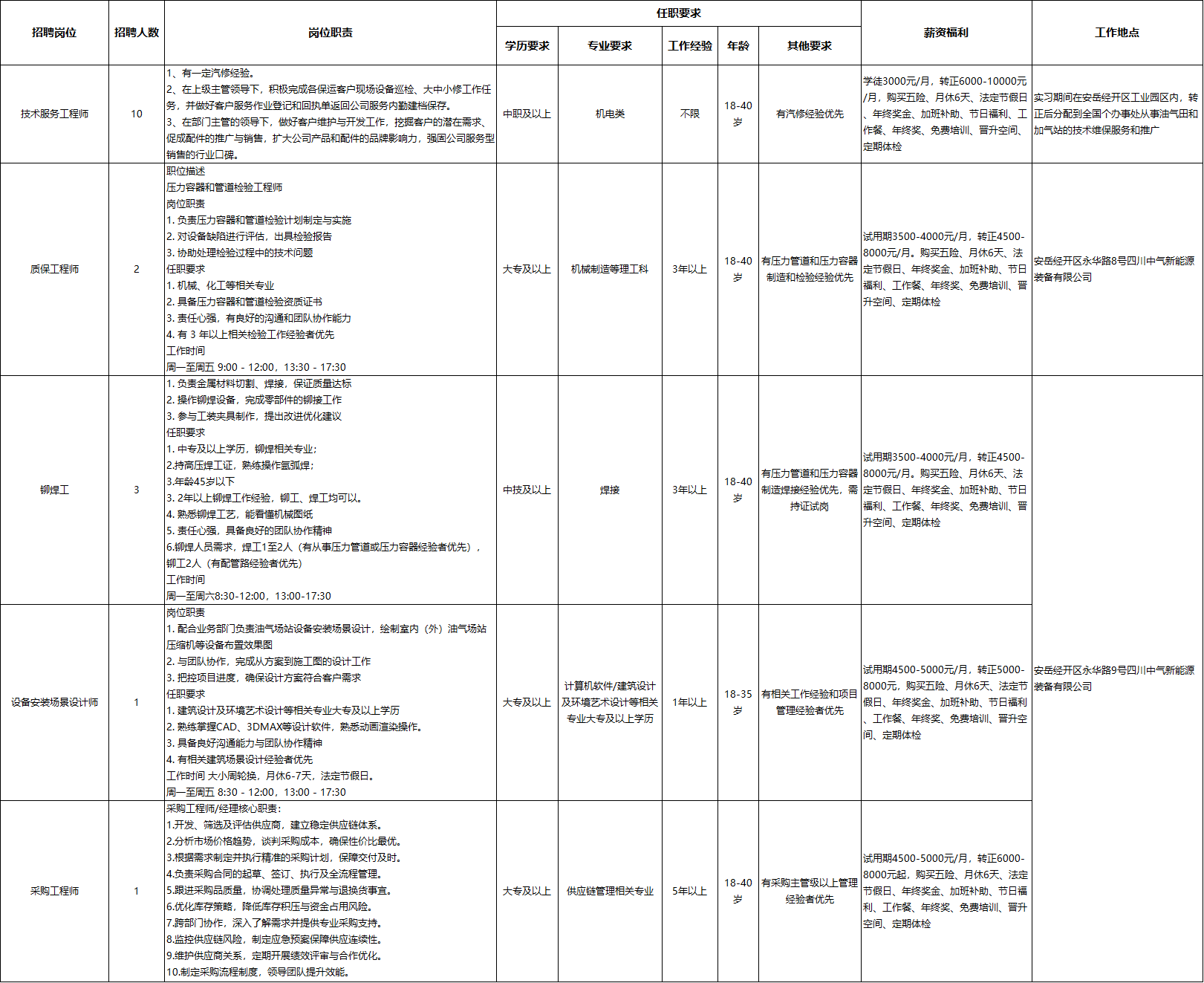 职位:2026招聘技术服务工程师|质保工程师|铆焊工|设备安装场景设计师|采购工程师