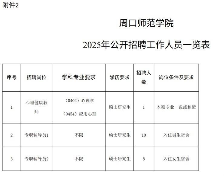 10.岗位所需的专业和其他条件(详见附件2《周口师范学院2025年公开招聘工作人员一览表》);