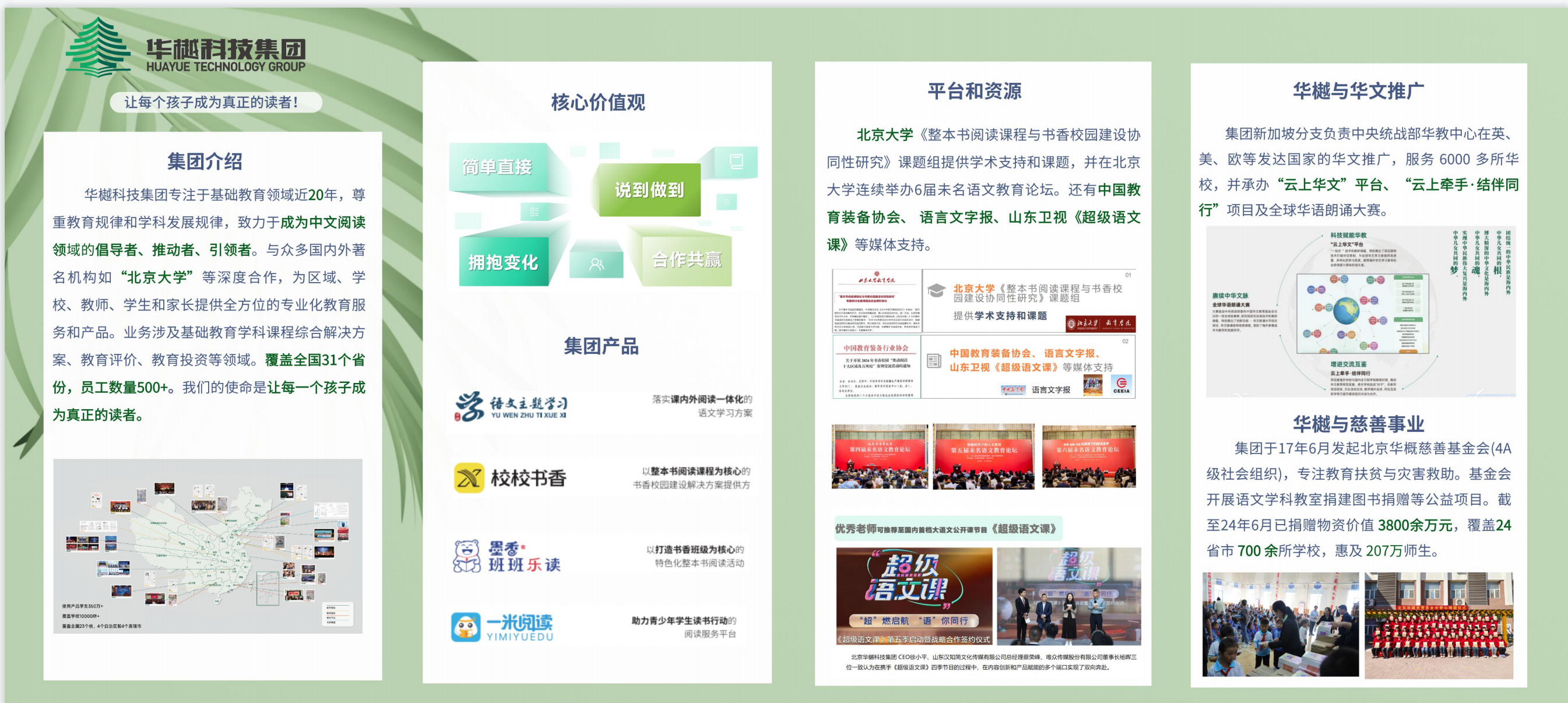 北京华樾科技集团专注于基础教育领域近20年,尊重教育规律和学科发展规律,致力于成为中文阅读领域的倡导者、推动者、引领者。