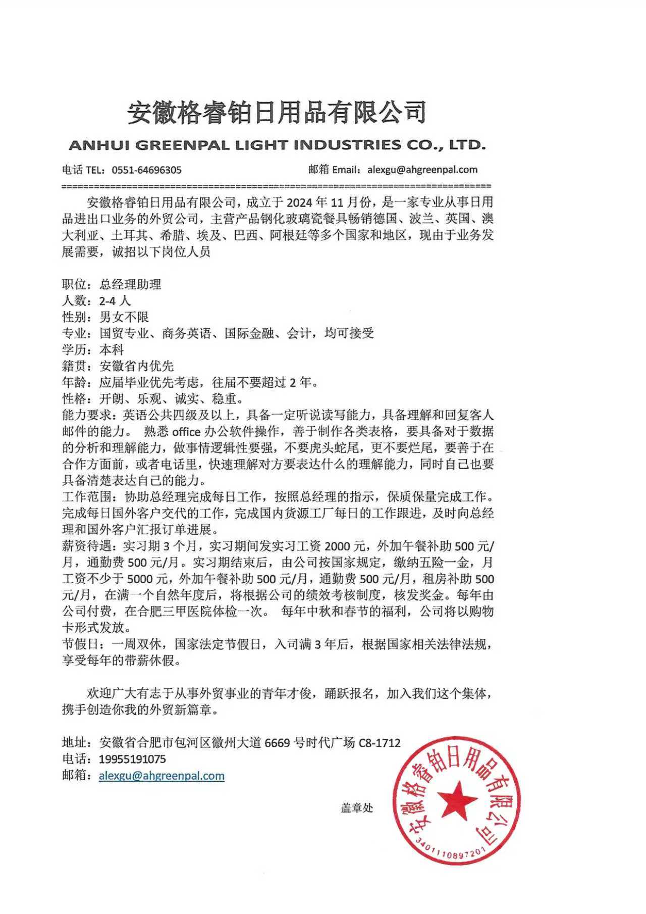 安徽格睿铂日用品有限公司招聘信息