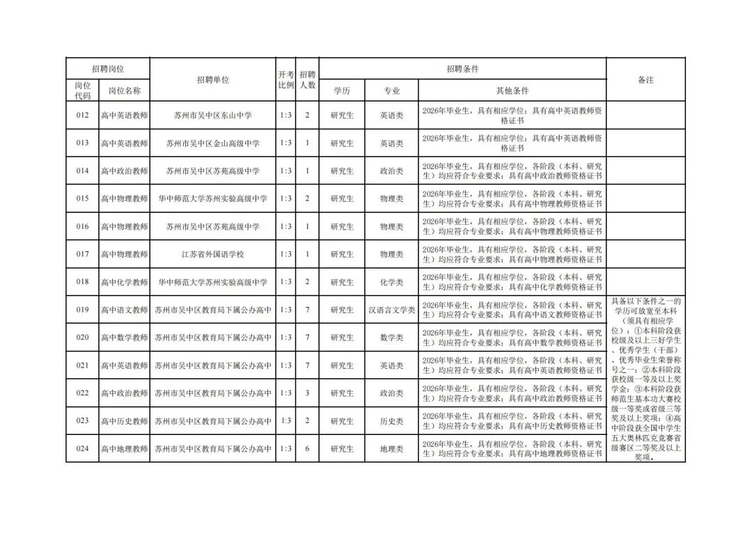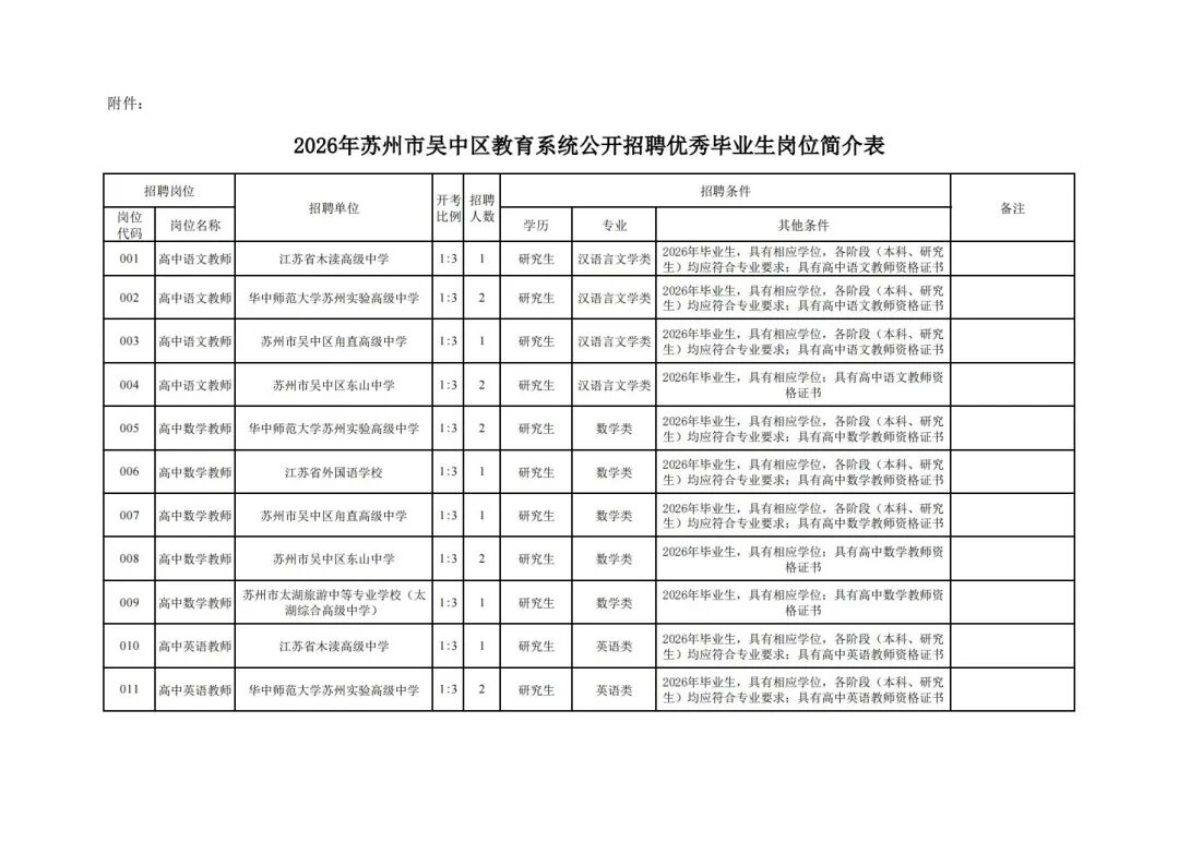 招聘岗位及条件等详见《2026年苏州市吴中区教育系统公开招聘优秀毕业生岗位简介表》(见附件,以下简称《岗位简介表》),可在苏州市人力资源和社会保障局网站(hr***.cn[点击查看])、“吴中教育热线”网站(ww***net[点击查看])上查询。
