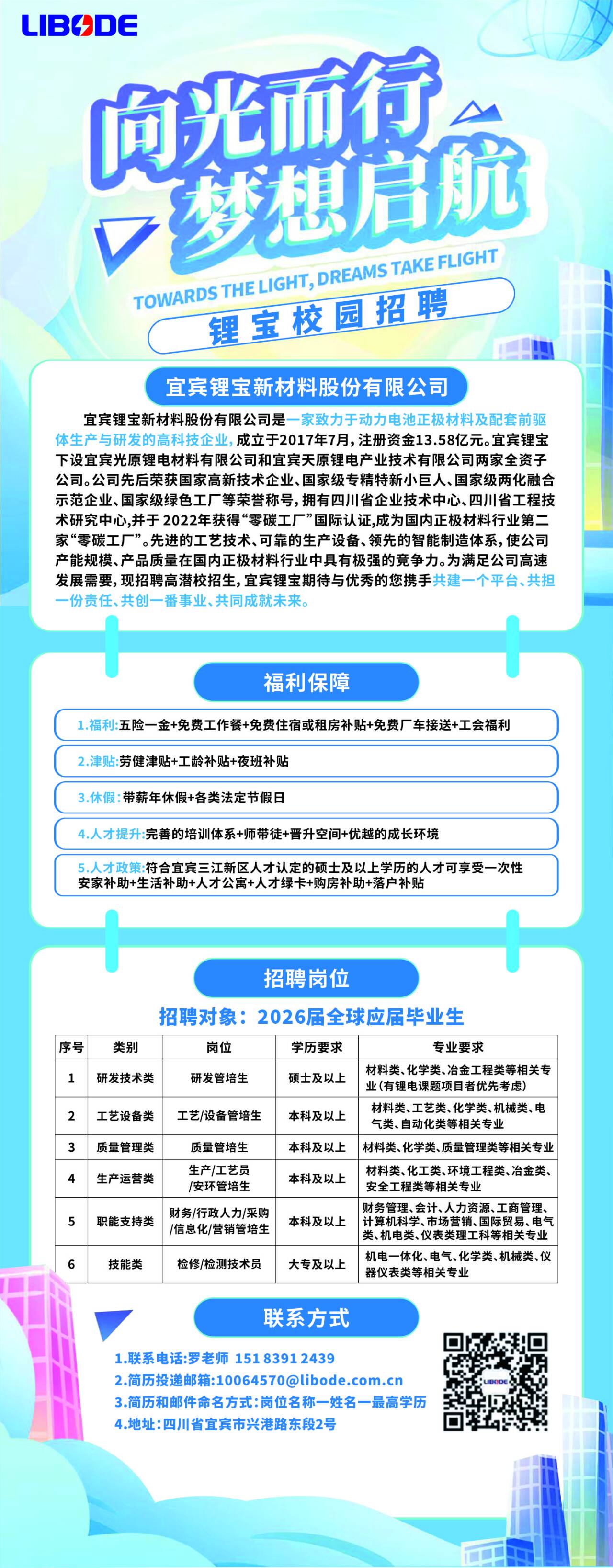 【宜宾锂宝校招热招中????】 宜宾锂宝坐落于宜宾市三江新区,是一家专注于锂电三元正极材料生产与研发的高科技企业,同时为国家高新技术企业、绿色制造示范单位。 现面向成都理工大学进行校招。面试通过需签订三方协议,毕业后正式入职购买五险一金,免费食宿+厂车接送,劳健、工龄等各类补贴齐全;校招福利待遇优厚,公司建立健全员工培养体系,企业拥有良好的文化氛围,为员工提供长远的职业发展平台。有志与企业共同发展的求职者,可联系周老师15328835767简历投递邮箱:10068030@(邮件主题建议标注“成都理工大学- 姓名-应聘岗位名称”)