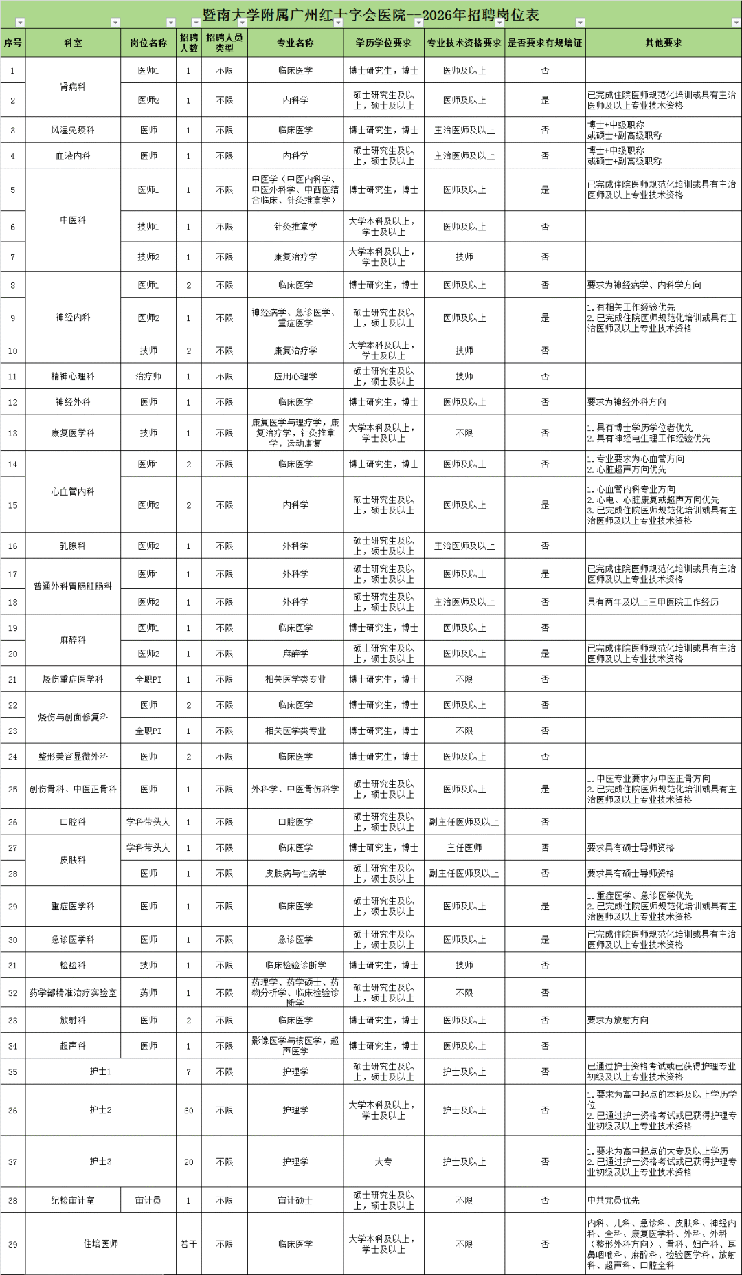暨南大学附属广州红十字会医院(广州市红十字会医院,广州市应急医院) 创建于1904年,是集医疗、教学、科研、预防、保健、康复、应急为一体的公立 三级甲等综合医院,是国家首批三甲医院 ,是广州市海珠区城市医疗集团总医院(西片区)。 暨南大学附属广州红十字会医院2026年招聘计划正式发布;岗位丰富,福利优厚,职等你来。期待与你并肩,一同以专业之力护佑安康。 【招聘岗位】医生:硕士研究生及以上学历学位;博士可入职规培(针对我院开放规培招生的专业)。医院落实住院医师规范化培训“两个同等对待”政策、相关人员可对照岗位条件要求报名。 护士:高中起点的大学专科及以上学历;入职前需通过护士资格考试或已取得护理专业初级及以上专业技术资格。 住培医师:本科及以上学历学位。