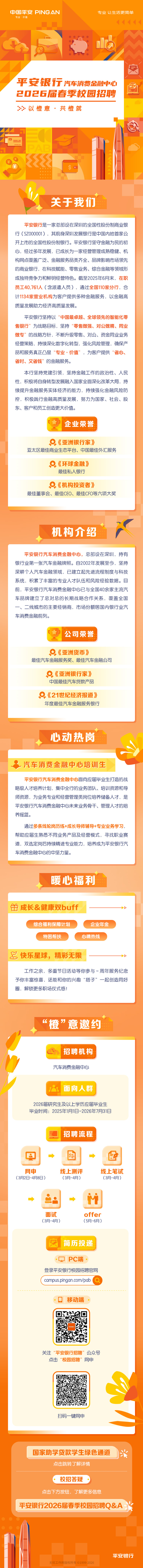 平安银行汽车消费金融中心2026年春季校园招聘简章一、平安银行简介平安银行是一家总部设在深圳的全国性股份制商业银行(SZ000001),其前身深圳发展银行是中国内地首家公开上市的全国性股份制银行。平安银行坚守金融为民的初心,经过多年发展,已成长为一家经营管理成熟稳健、机构网点覆盖广泛、金融服务品类齐全、品牌影响市场领先的商业银行,在科技赋能、零售业务、综合金融等领域形成独特竞争力和鲜明经营特色。截至2025年6月末,在职员工40,761人(含派遣人员),通过全国110家分行,合计1134家营业机构为客户提供多种金融服务,以金融高质量发展助力经济高质量发展。平安银行坚持以“中国最卓越,全球领先的智能化零售银行”为战略目标,坚持“零售做强、对公做精、同业做专”的战略方针,不断升级零售,对公,资金同业业务经营策略,持续深化数字化转型,强化风险管理,确保产品和服务真正凸显“专业·价值”,为客户提供“省心、省时、又省钱”的金融服务。本行坚持党建引领,坚持金融工作的政治性、人民性,积极将自身转型发展融入国家全面深化改革大局,持续提升金融服务实体经济的能力,持续强化金融风险防控,积极践行金融高质量发展,努力为国家、社会、股东、客户和员工创造更大价值。二、平安银行汽车消费金融中心简介平安银行汽车消费金融中心总部设在深圳,是平安银行旗下的专营机构,持有银行业第一张汽车金融牌照。自2002年发展至今,坚持深耕个人汽车金融领域,已建立起先进流程制度与科技系统,积累了丰富的专业人才队伍和风险经验数据。目前,平安银行汽车消费金融中心已与全国40余家主流汽车品牌建立了总对总的长期战略合作关系,覆盖全国一、二线城市的主要经销商,市场份额居国内银行业汽车消费金融前列。三、招聘岗位及任职要求招聘岗位:平安银行汽车消费金融中心培训生招聘人数:20名工作地点:深圳岗位职责:1、入职后需完成18个月以内的前、中台复合轮岗历练,包括适岗训练、轮岗见习、管理见习等学习实践任务,熟悉汽车消费金融中心各业务板块战略、产品及经营模式。2、轮岗期间实行严格的考核、管理机制,轮岗期结束后根据培养情况双选定岗。3、轮岗期间深刻理解银行汽车消费金融中心基层运营模式,树立风险合规意识和客户服务精神,提高个人基本胜任素质、专业素养和工作能力,为后续职业发展奠定扎实的业务基础,并选择自己的职业赛道。任职要求:1、硕士研究生或以上学历,专业不限,经济学、管理学、数学、计算机等专业或复合知识背景优先。2、对金融行业感兴趣、有金融相关实习工作经验者优先。3、具备优秀的逻辑思维能力、分析创造能力、组织协调能力和团队合作意识,心态积极、自我驱动、结果导向。4、能接受1-2年的轮岗历练,勇于接受挑战,综合素质突出。四、薪酬福利体系1、薪酬待遇:面议。2、全方位生活保障+健康关怀:综合福利保障计划、特困帮扶、企业年金计划、心晴热线等。3、多重节日活动+多元化业余生活:周年服务纪念、各类节日活动、兴趣“同好圈”等。五、应聘方式1、简历投递:扫码一键网申