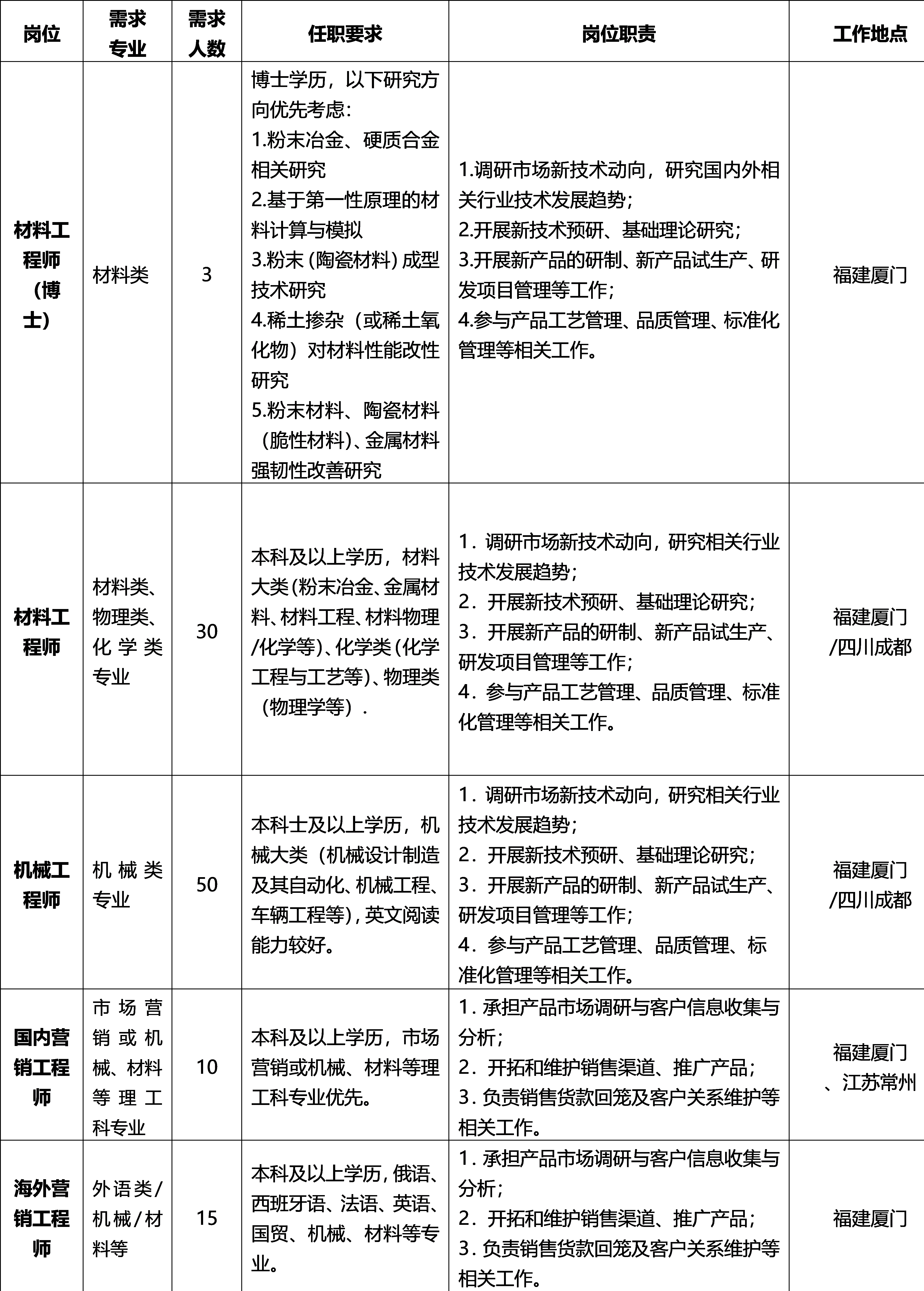 材料工程师 | 机械技术|智能制造|精密制造|材料研发|电气测试 | 全职 | 本科 | 50 | 10000-12000 | 点击进入 |