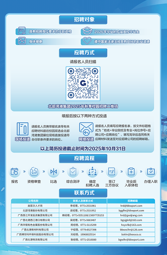 宣讲公司:广西北部湾国际港务集团有限公司2026校园招聘 宣讲地点:教学楼114 宣讲日期:2025-10-15 宣讲时间:11:00 详情: