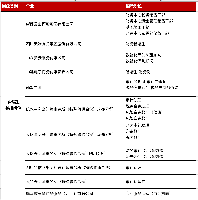 德勤中国、普华永道、信永中和、天健、天职、四川华信、大华、毕马威智慧商务服务(四川)有限公司、中兴新云、中建电商、云图控股、天味食品等多家头部事务所与优质名企现场直招,为你敞开职业大门。