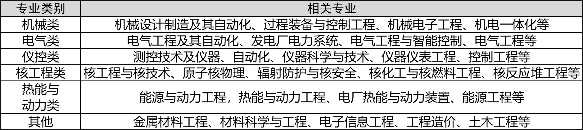 机械类、电气类、仪控类、核工程类、热能与动力类专业。