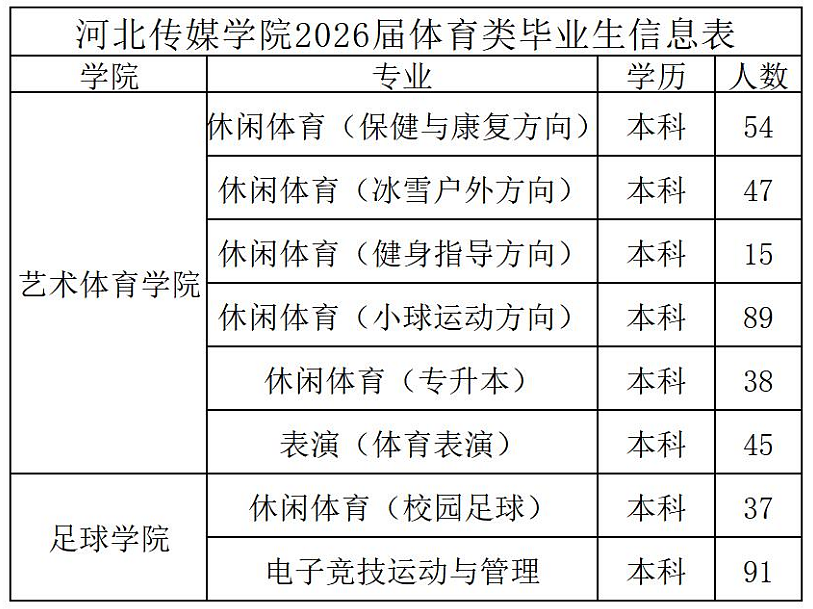 首先感谢贵单位对我校体育类毕业生就业工作的关注和支持!为深入贯彻落实学校就业工作相关要求,为企业和体育类学生搭建高质量供需对接平台,全力促进2026届毕业生尽早就业、高质量就业,拟定于2025年11月28日举办河北传媒学院2026届体育类毕业生校园双选会活动,诚挚邀请贵单位报名参加,具体事项如下: