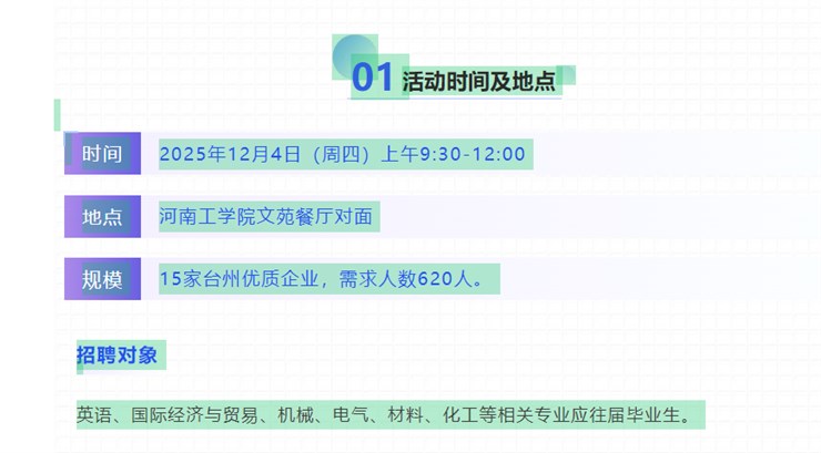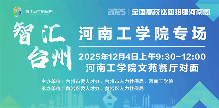 教学1号楼A105大厅宣讲主题:2025年智汇台州-河南工学院专场招聘会