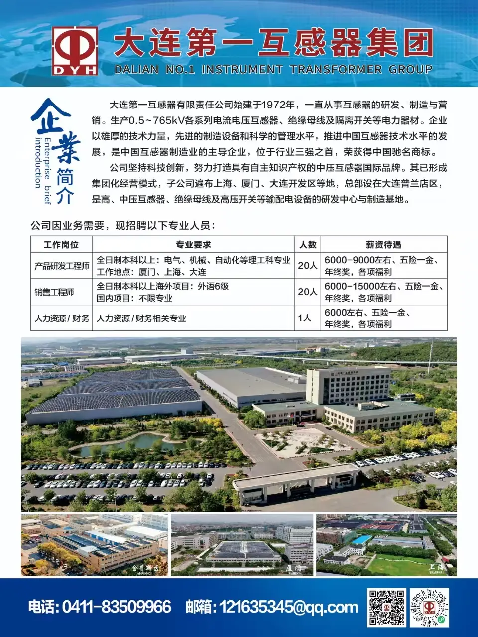 西区1号楼第4宣讲厅大连第一互感器有限责任公司始建于1972年,一直从事互感器的研发、制造与营销。生产0.5 ~765kV各系列电流电压互感器、绝缘母线及隔离开关等电力器材。企业以雄厚的技术力量,先进的制造设备和科学的管理水平,推进中国互感器技术水平的发展,是中国互感器制造业的主导企业,位于行业三强之首,荣获得中国驰名商标。